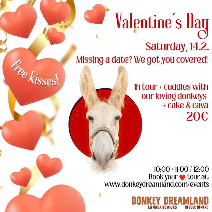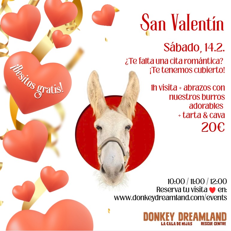 El sábado 14.2, te invitamos a pasar una hora mágica en Donkey Dreamland con mimos, besos (¡sí, besos de burro!) y mucho amor. 🫏